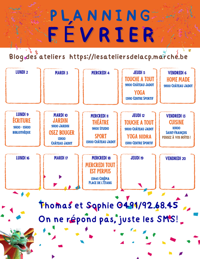 Hello tout le monde ! Pas toujours facile de venir aux ateliers… Les enfants sont malades, les journées pédagogiques s’enchaînent, les travaux n’en finissent pas, panne de chauffage, panne d’oreiller, panne de planning, microbes d’hiver/printemps/été/automne, mal aux cheveux, jour de son anniversaire, pas envie de se lever, pas envie de venir, pas envie de voir d’autres personnes, autre chose à faire, autre chose à penser, on a oublié, on savait pas, on a mal au dos, mal aux dents, j’ai raté le bus, le bus n’est pas venu, il y a grève des bus, j’ai un autre rendez-vous, j’ai pas toujours le temps, j’ai pas d’autre excuse que celle-ci, il pleut, il fait trop froid, il fait trop chaud, Thomas et Sophie sont méchants (non, ça c’est pas vrai 😇)… Beaucoup d’excellentes raisons de ne pas venir aux activités.
